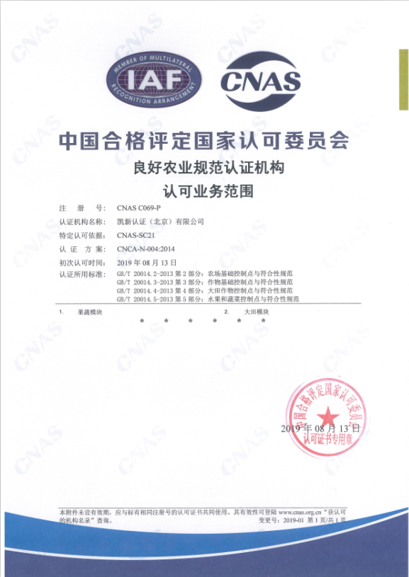 2019年8月13日,有機和良好農(nóng)業(yè)規(guī)范認證(GAP)領(lǐng)域獲得CNAS認可資格。認可范圍范圍包括: