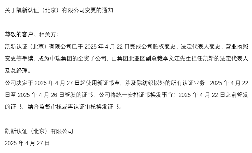 工作通知關(guān)于紡織認(rèn)證部認(rèn)證證書變更的通知